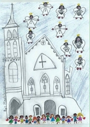 What a beautiful drawing by a child here in Charleston. As the nine angels now watch over their Holy City, may we continue to unite and show God’s Love and Forgiveness to all people! At the bottom of the picture, the child artist draws all races of people coming together in unity. “A tragic and unspeakable event took place on Wednesday, June 17th, 2015, in Charleston, SC, –my home state.”